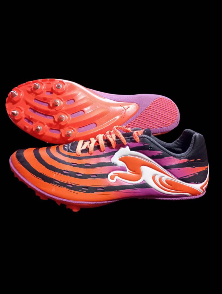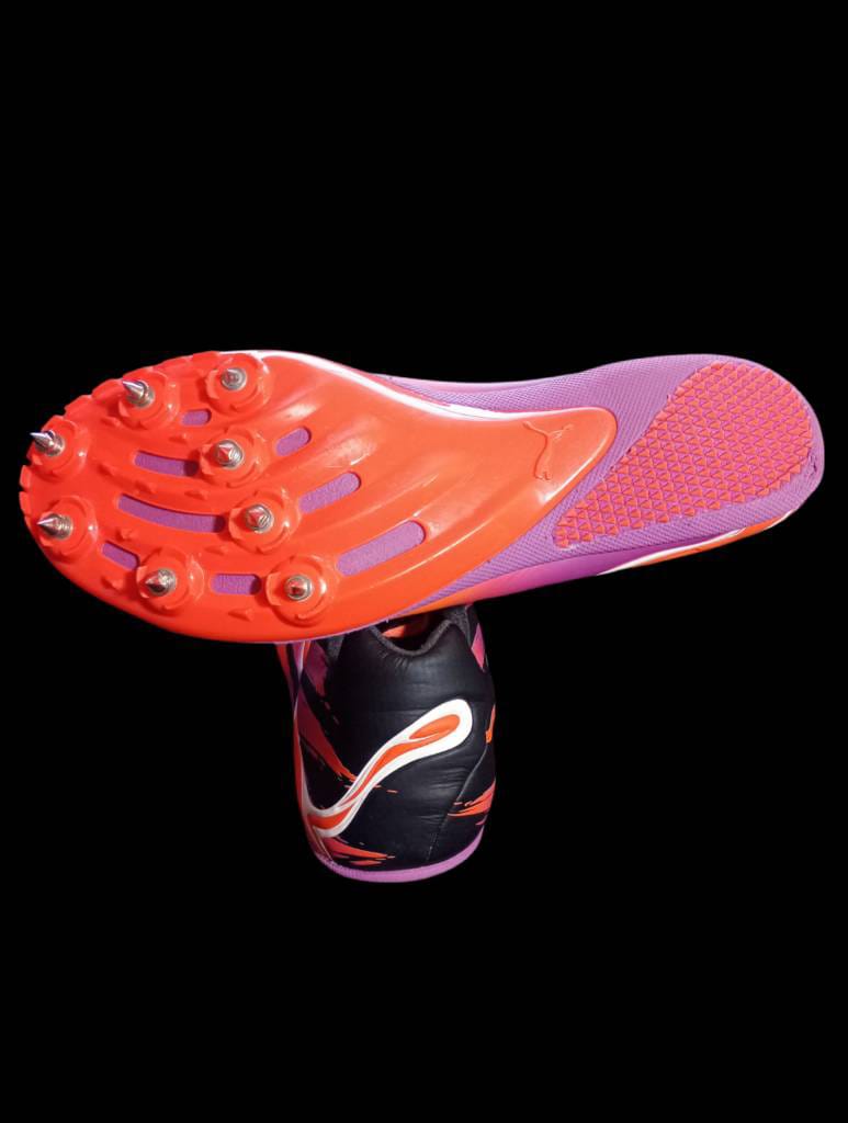Suela:La suela exterior es de color naranja brillante con clavos, diseñada para proporcionar tracción en pistas de atletismo.
